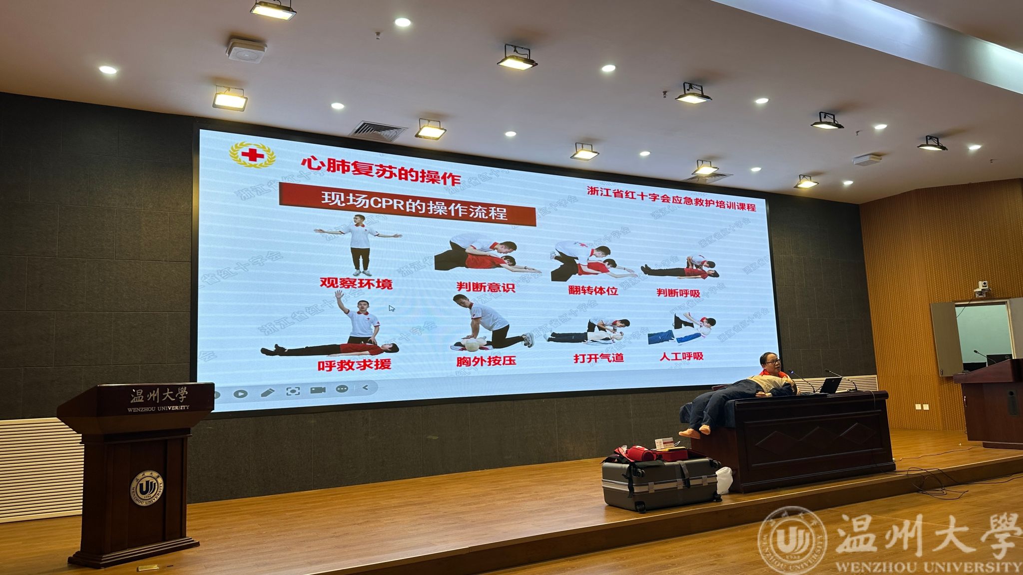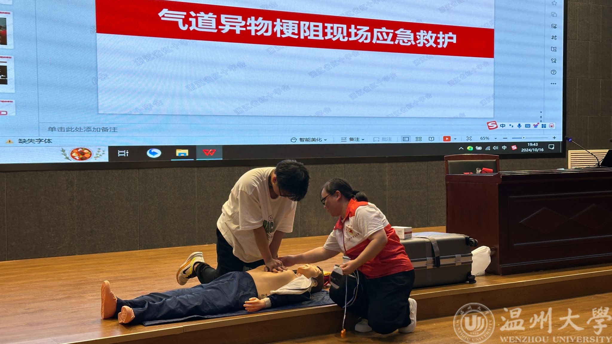 10月16日晚上,beat365官网在岩松堂步青厅成功举办了一场以“大学生安全自救知识”为主题的讲座,本次讲座由beat365在线唯一官网医务室吴洁医生主讲,吸引了众多大学生前来聆听学习。讲座的内容贴合大学生实际,主要由两部分构成,一是现场CPR操作和AED的使用,二是气道异物梗阻的现场应急救援。