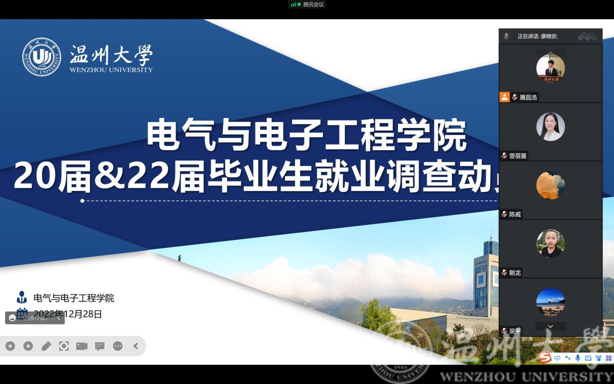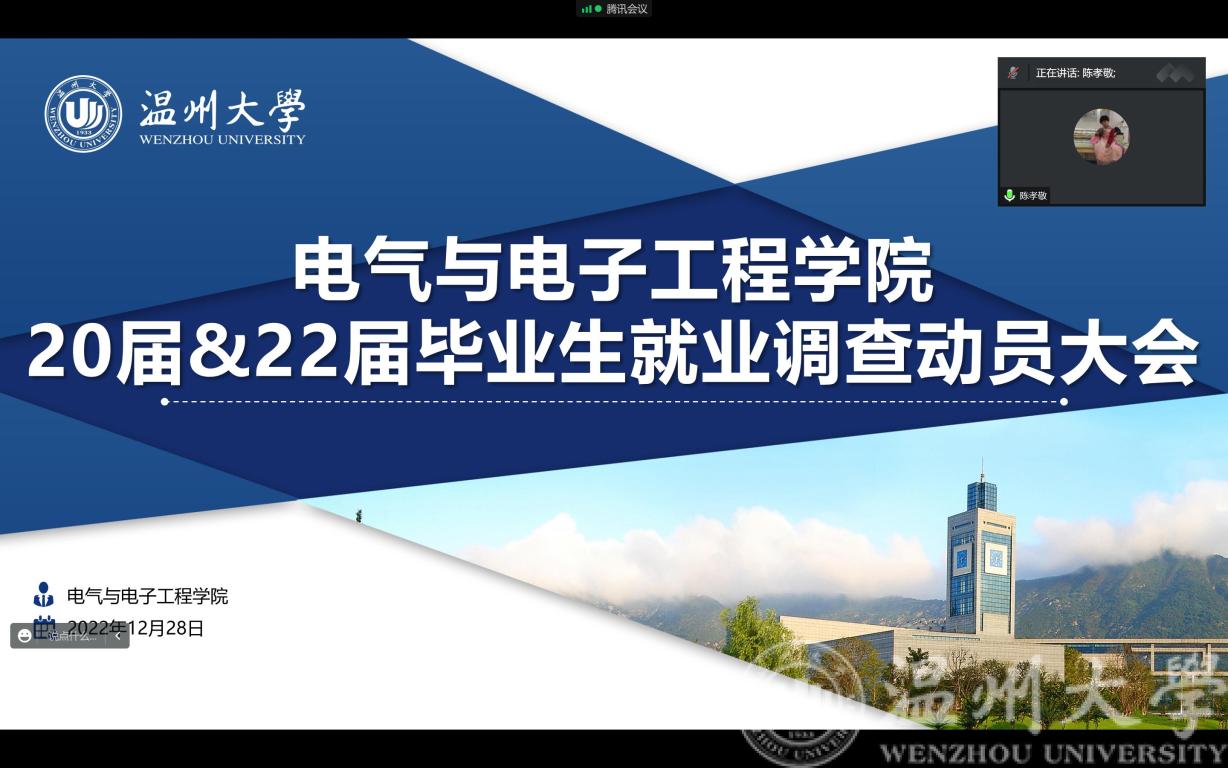 12月28日下午2:00,beat365官网召开20届与22届毕业生就业调查动员大会线上会议。副院长陈孝敬、党委副书记曾蓓蕾、电气系主任吴平、电子系主任庄友谊、学工办主任廖晓安以及20届与22届各毕业班班主任参会,会议由学工办就业辅导员屠昌浩主持。