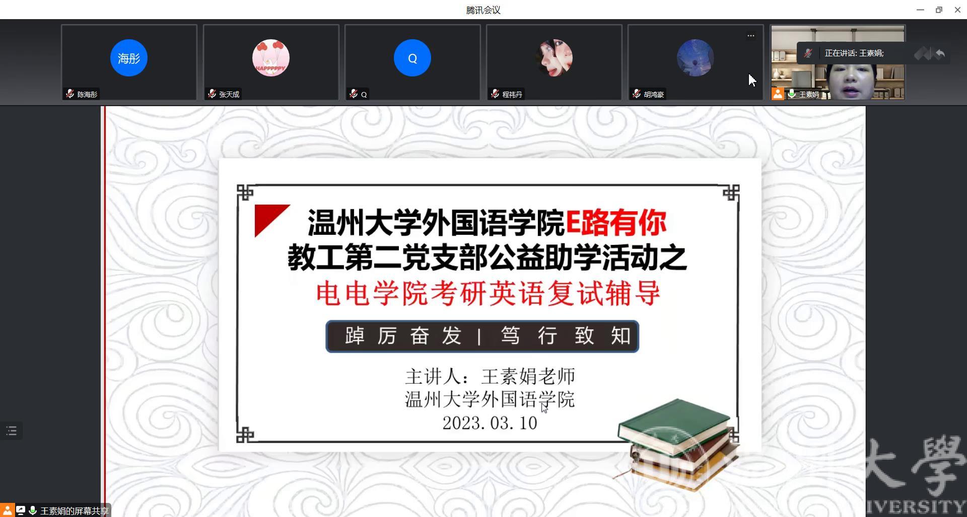 为帮助2023年考研学子轻松应对复试中英语面试环节,助力学子顺利上岸,3月10日晚上19:30beat365官网在线上开展2023年考研复试英语面试培训活动。本次活动邀请到外国语学院“E路有你”教工第二党支部书记王素娟老师为学子们进行公益助学指导,打通研途“最后一公里”,助力学子圆梦。