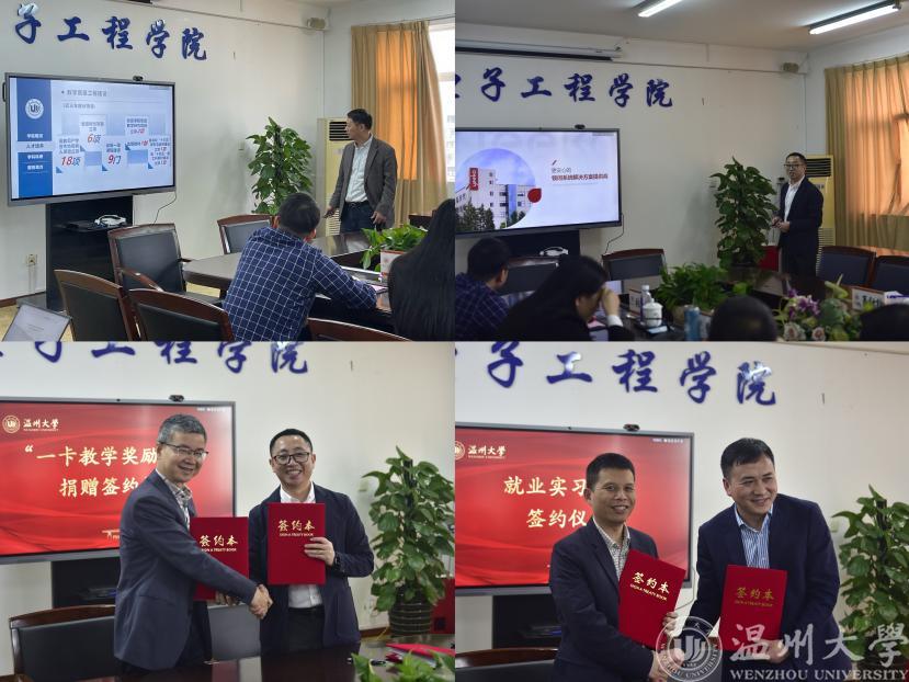 汪鹏君院长代表学院对项文广总经理一行表示热烈欢迎,并从学校情况、学院概况、人才培养、学科科研和服务地方等方面做了较为详细的介绍。项文广总经理也简要介绍了公司发展历程、主要产品和企业文化等内容。随后,双方进行了“一卡教学奖励基金”捐赠签约仪式与就业实习基地签约仪式。