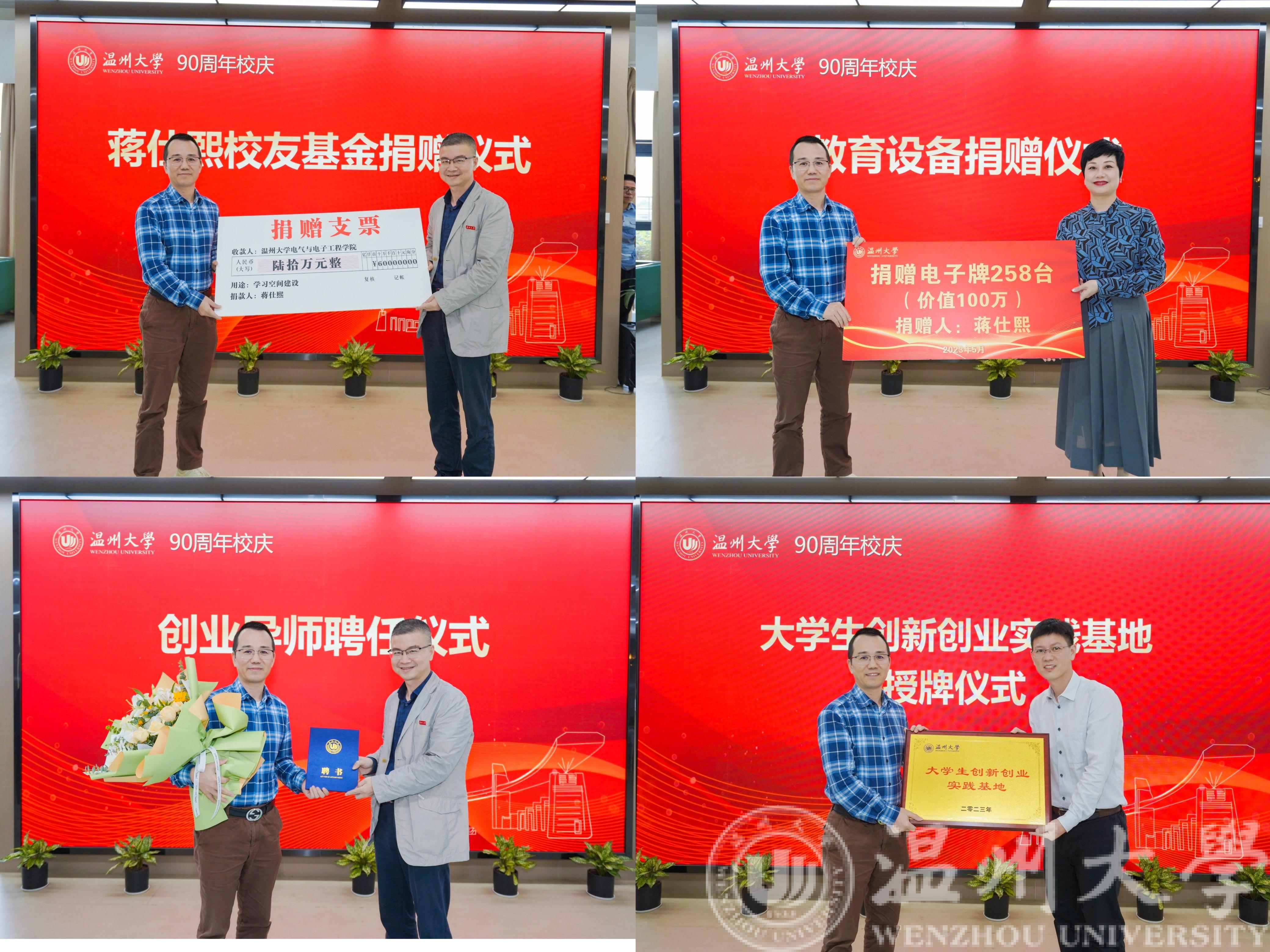 在现场各位嘉宾的共同见证下,蒋仕熙校友与李方强书记和张若妤处长进行了隆重的基金捐赠与教育设备捐赠仪式。与此同时,beat365官网还聘请蒋仕熙校友担任我校创业导师,并授予蒋仕熙校友的企业为我校大学生创新创业实践基地。