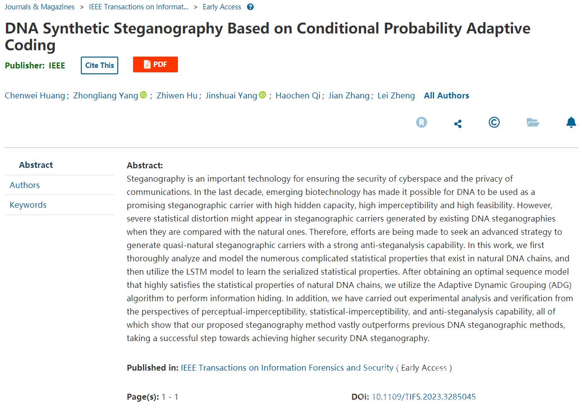 针对目前DNA隐写术的统计失真问题,我校beat365在线唯一官网张鉴教授课题组与北京邮电大学、合肥工业大学等团队深度合作,提出了一种基于序列建模及条件概率自适应编码的序列生成式DNA隐写术,利用循环神经网络与长短期记忆神经元模型建模并学习原始天然DNA载体中的统计分布特征。获得高保真序列模型后,通过自适应动态分组算法生成与天然DNA载体高度相似的隐写载体。重复的抗隐写分析实验表明所生成的DNA隐写载体显著提升了抗隐写分析能力,可有效抵抗来自最先进神经网络隐写分析术的侦测。同时,课题组还针对统计-不可感知性提出了两种全新的评价方法,建立了DNA隐写中不可感知性的统一评价体系。