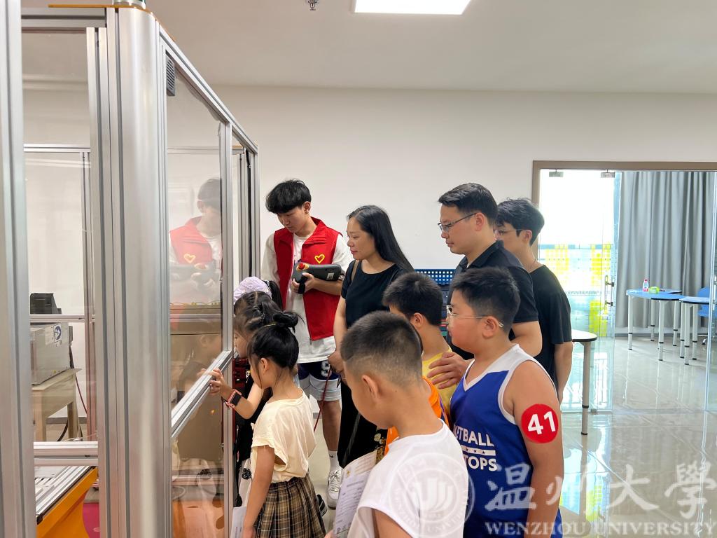 上午9:30左右,beat365在线唯一官网云智立暑期科创实践团队迎来了30余位参加科研活动的小朋友,他们对高科技的设备、VR展示厅与机器人项目等产生了浓厚的兴趣。云智立科创实践团队的队员们,身穿红马甲,亲切友好的向孩子们展示和演示机器设备。曾蓓蕾副书记一行参观了VR展厅、机器人小车、AI视觉分拣系统、工业机械臂等科普项目,了解了实践队智能制造公益活动的基本情况。