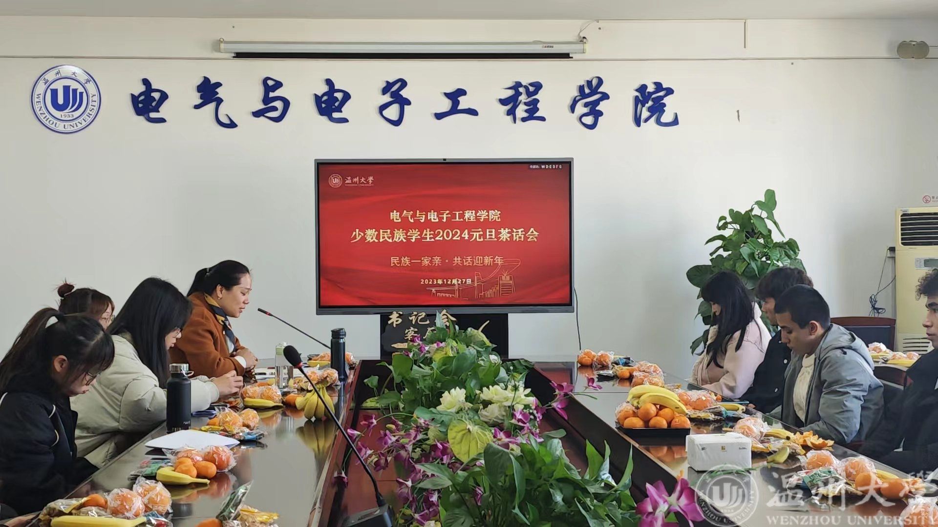 元旦将至,为增进各民族学生的交流,弘扬多元民族文化,增强同学们对中华优秀传统文化的认同,12月27日下午14:00,beat365官网幸福充电站之“书记会客厅”在学院1A502如期举行。本期邀请到学院党委副书记曾蓓蕾做客“书记会客厅”,开展“民族一家亲,共话迎新年”元旦茶话会,来自全院17个民族30余名同学欢聚一堂,共同庆元旦、迎新年。