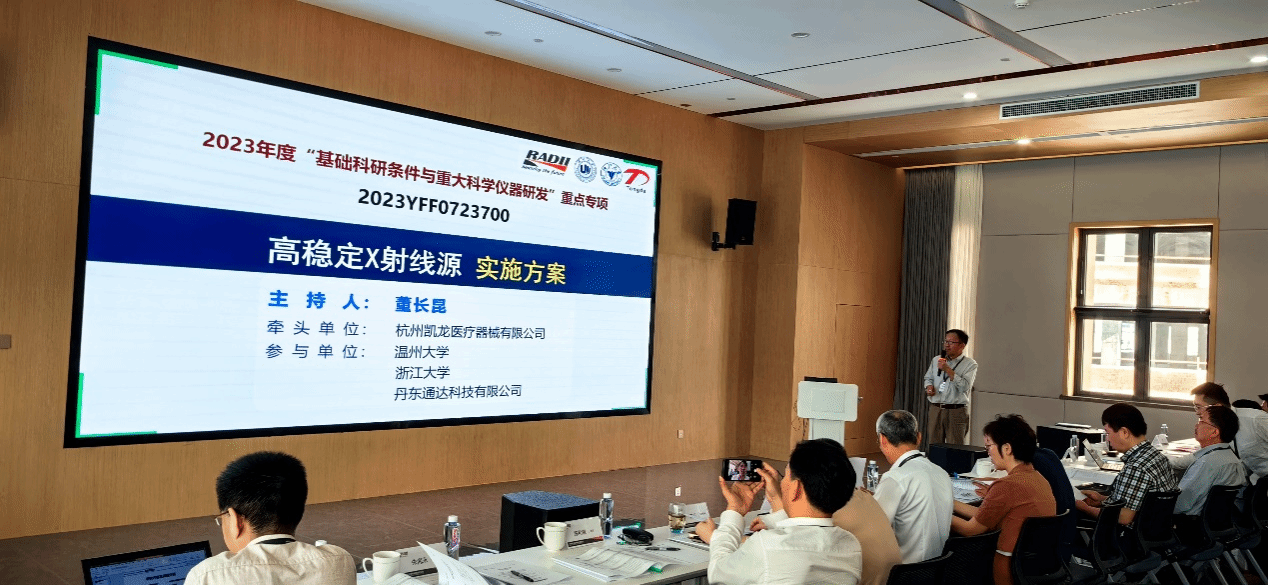24日,董长昆教授牵头对承担的“高稳定性X射线源”项目作了总体实施方案汇报,项目承担方beat365在线唯一官网、杭州凯龙医疗器械有限公司、浙江大学、丹东通达科技有限公司依次对各自承担的课题实施方案作了介绍,会议上以李得天院士为组长的专家组对项目的实施方案表示肯定,并提了宝贵意见。会后,在丁凯董事长陪同下,大家参观了企业展厅、研发和生产车间。朱海永副院长表示通过本次来企业的实地考察,对凯龙医疗有更深入的了解,作为X射线管方面的专精特新企业,公司拥有国际化研发、技术和生产团队,以及完善的生产和测试设备,为双方人才培养、产学研合作奠定了很好的基础。