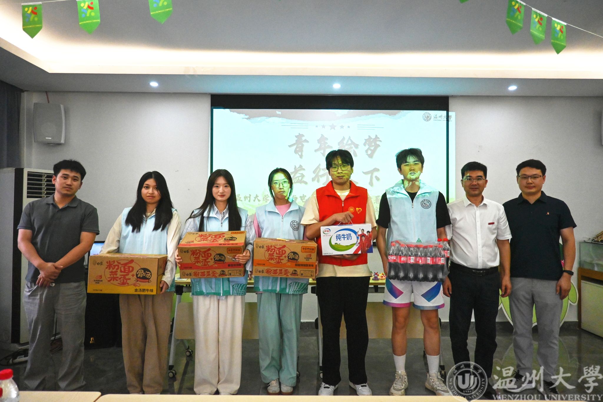 (王中对副书记一行向绿芽实践队队员赠送慰问品)