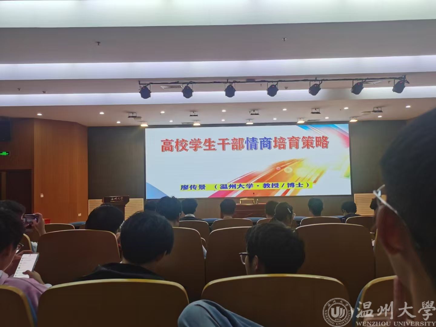 2024年11月4日晚18:30,beat365官网大一全体学生干部在岩松堂步青厅开展本学期心理幸福课。本次课程由廖传景教授主讲,此次培训聚焦于一个至关重要却常被忽视的主题——学生干部的情商培育。廖老师以其深厚的学术底蕴和丰富的实践经验,生动诠释了情商在学生干部成长与发展中的不可替代作用。