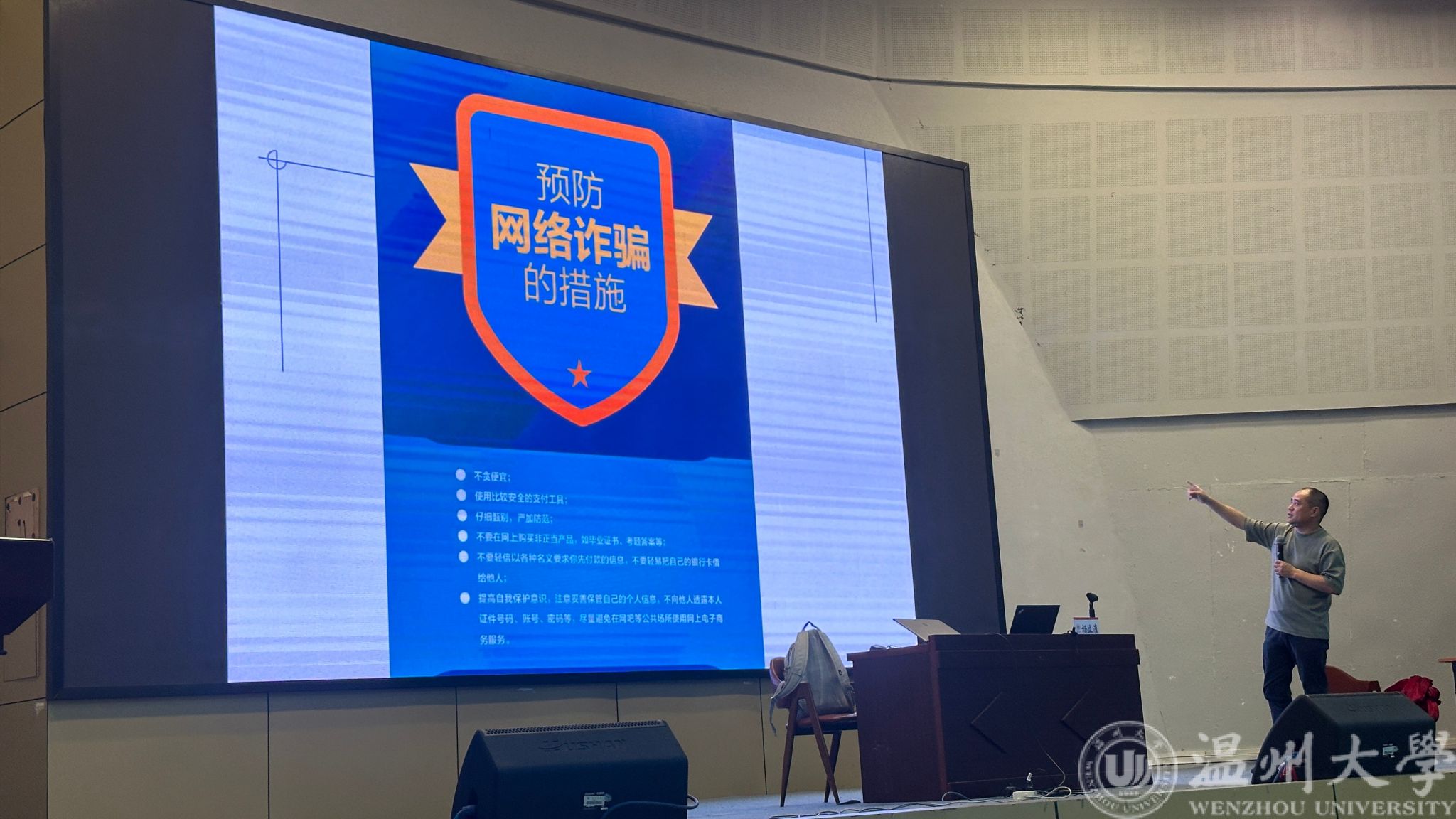 面对互联网这把 “双刃剑”,杨教授结合近期网络诈骗、个人信息泄露等热点事件,深入剖析其两面性。他强调,互联网在便利生活的同时,也暗藏隐私泄露、网络沉迷等风险,大学生需时刻保持清醒认知,树立 “做互联网主人” 的意识。针对网络安全防护,杨教授重点阐释 “三不” 原则 ,为同学们筑牢网络安全防线。