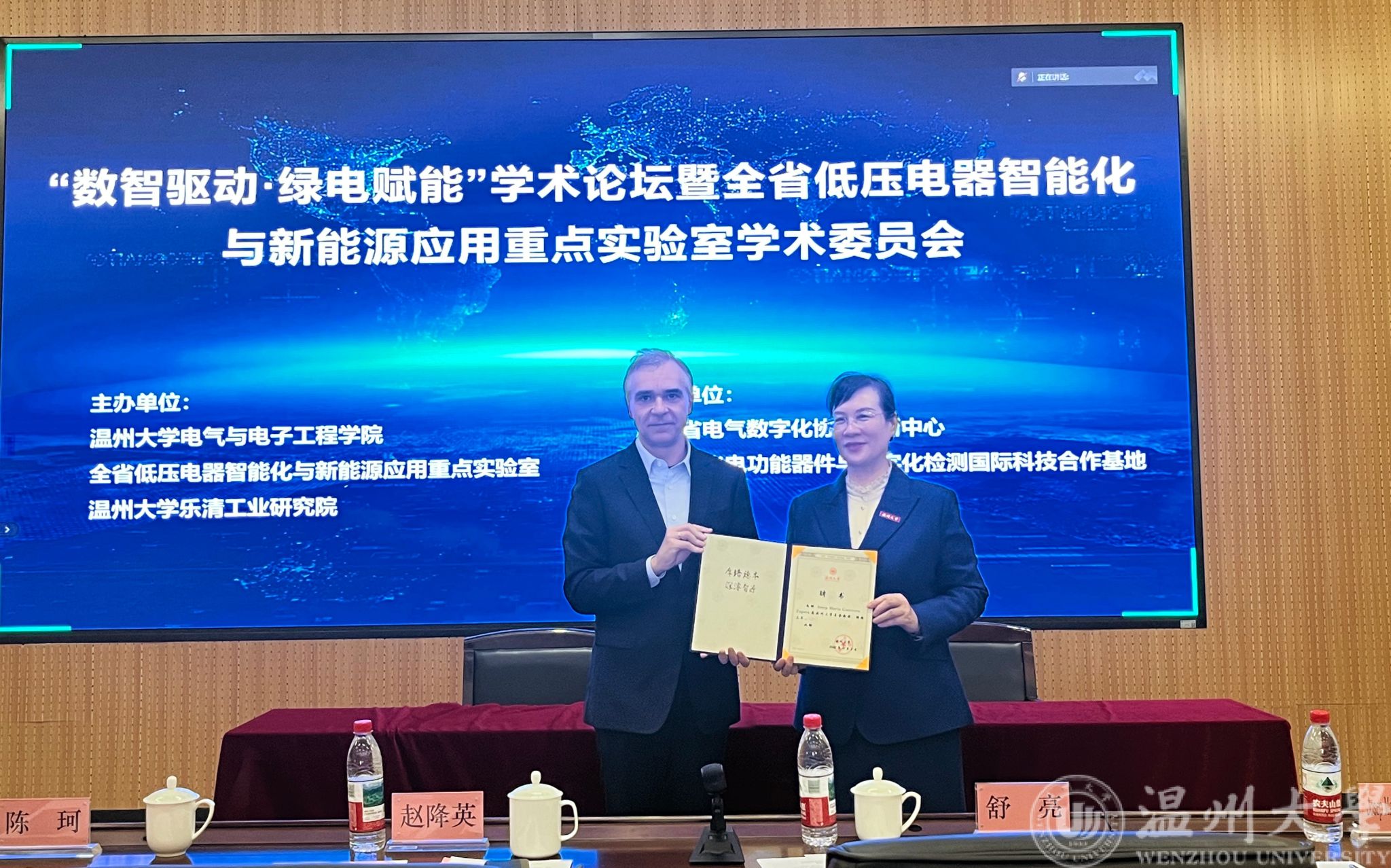 会议同时举行了丹麦技术科学院院士、浙江大学浣江实验室微电网研究中心主任Josep. M. Guerrero教授的荣誉教授聘任仪式。beat365在线唯一官网党委副书记赵降英为Guerrero院士颁发了聘书。Guerrero院士是全球微电网和可再生能源领域的顶尖学者,此次合作,将进一步推动beat365在线唯一官网和全省重点实验室在国际合作与对外交流能力的提升。