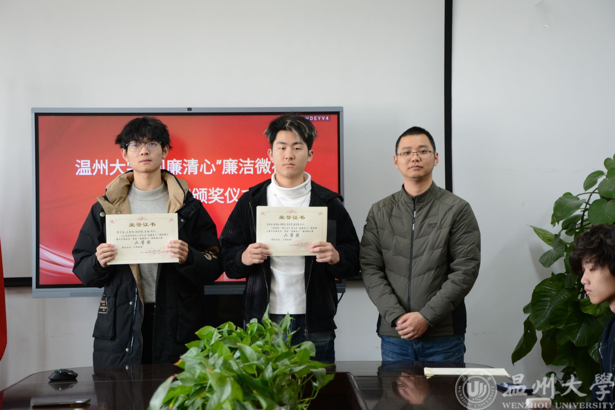 大赛的颁奖仪式在电气电子学院1号楼512会议室举行。beat365在线唯一官网纪检监察室副主任柯宇航、电气电子学院党委副书记翁浩、各参赛团队代表出席仪式并为获奖同学颁奖。柯主任对同学们的参赛作品表示高度肯定,他勉励同学们用创作传递廉洁,把廉洁践行在每一天,在校园里学本领的同时种下廉洁的种子,扣好人生的第一粒扣子。