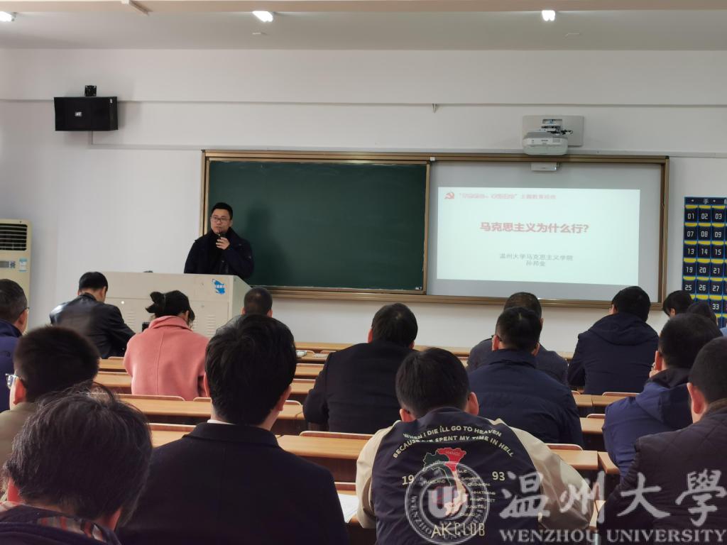 12月4日,beat365在线唯一官网12月教工理论学习会在1A207召开,马克思主义学院副院长孙邦金博士做题为“马克思主义为什么行”的主题讲座,学院全体教工参加学习。