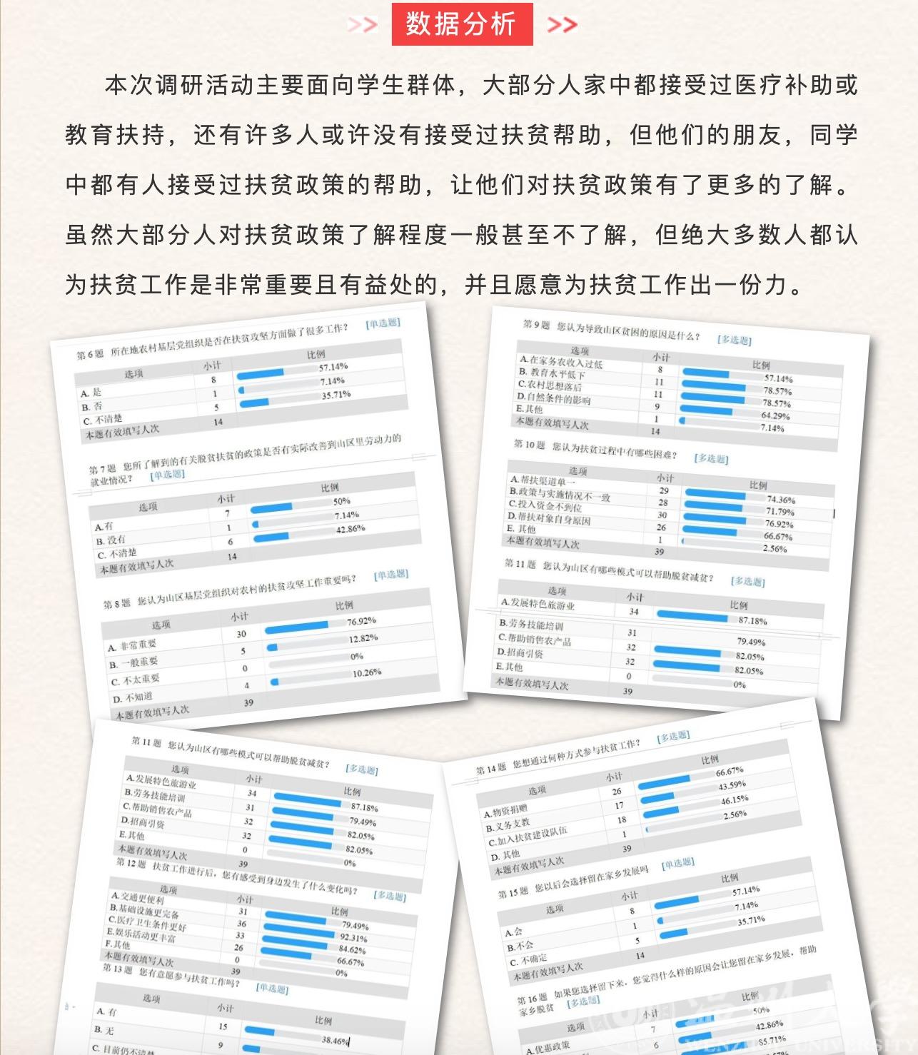 2020年8月8日,beat365在线唯一官网第一届“益行”暑期社会实践队关于山区扶贫线上调研活动圆满完成。为引导人们关注贫困问题、关爱贫困人口、关心扶贫工作,营造“人人皆愿为”的社会扶贫氛围,弘扬“人人皆可为”的公众扶贫理念,体验“人人皆能为”的参与扶贫机制,也为了“益行”暑期实践队后续活动更好的展开,实践队线上全体成员开展了关于山区扶贫的线上调研活动,旨在通过线上调研活动,分析人们对于扶贫工作的了解程度,让更多的人关注扶贫工作,参与扶贫工作中来。
