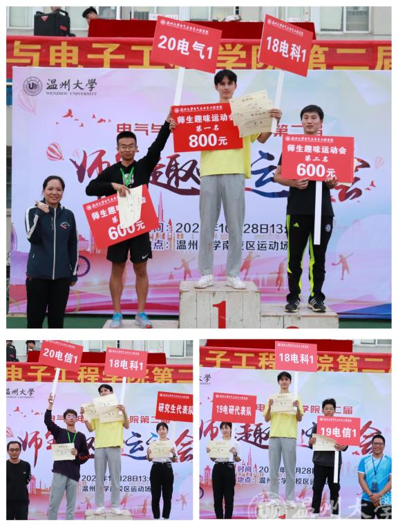 下午16:30,举行此次趣味运动会的颁奖仪式。由学工办辅导员潘龙飞宣读了分项奖和团体名次,学院党委副书记曾蓓蕾,工会主席宋元平,学工办主任、团委书记廖晓安给获奖班级和团体颁奖,并合影留念。
