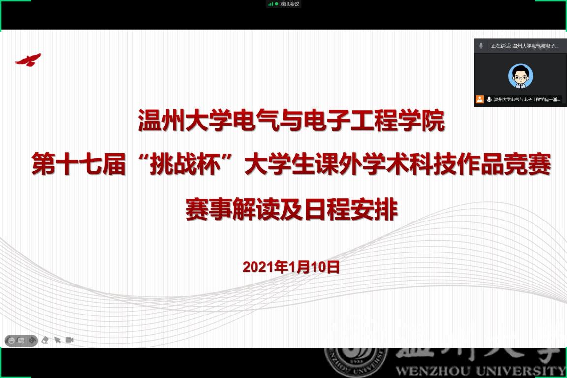 为及时传达1月8日校团委召开的“第十七届‘挑战杯’大学生课外学术科技作品竞赛赛事动员大会”的会议精神,进一步提高beat365官网师生参与大赛的热情,更好的为师生答疑解惑,1月10日晚18:30,beat365官网召开“第十七届‘挑战杯’大学生课外学术科技作品竞赛赛事解读及日程安排”线上会议。学院院长汪鹏君、党委副书记曾蓓蕾,及预参赛项目的学生和部分指导老师参与了此次会议,会议由学院负责科创工作的辅导员潘龙飞主持。