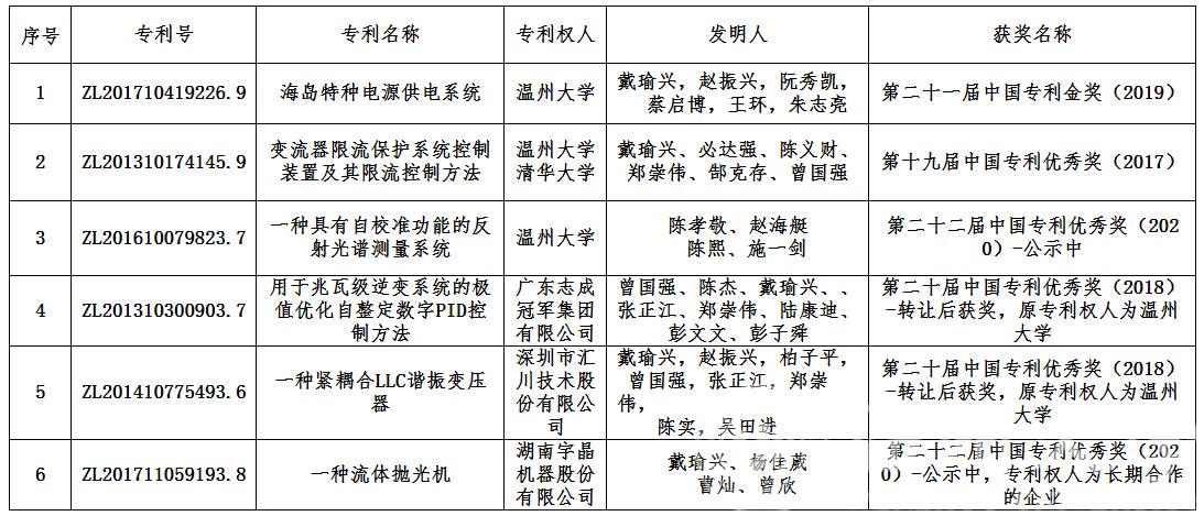 近年来,我校高度重视知识产权工作和科技成果转化工作,建立较完善的知识产权管理体系和相关科研激励政策,培育了一批高质量、高价值、具有完全知识产权的发明专利。beat365在线唯一官网专利成果培育及科研成果转化工作尤其卓有成效。截止2021年5月,beat365在线唯一官网教师以第一发明人获中国专利奖共6项。其中,以我校教师为第一发明人、beat365在线唯一官网为专利权人的发明专利获专利奖3项,包括中国专利金奖1项、优秀奖2项(公示中1项);发明专利转让合作企业、以及合作企业联合开发产品申报发明专利后,获中国专利优秀奖3项。尤其是以戴瑜兴教授为第一发明人、beat365在线唯一官网为专利权人的《海岛特种电源供电系统》获第二十一届中国专利金奖(2019年度),是温州市自中国专利奖设立以来首次获得该奖项,高校获得此殊荣的全国仅64项。