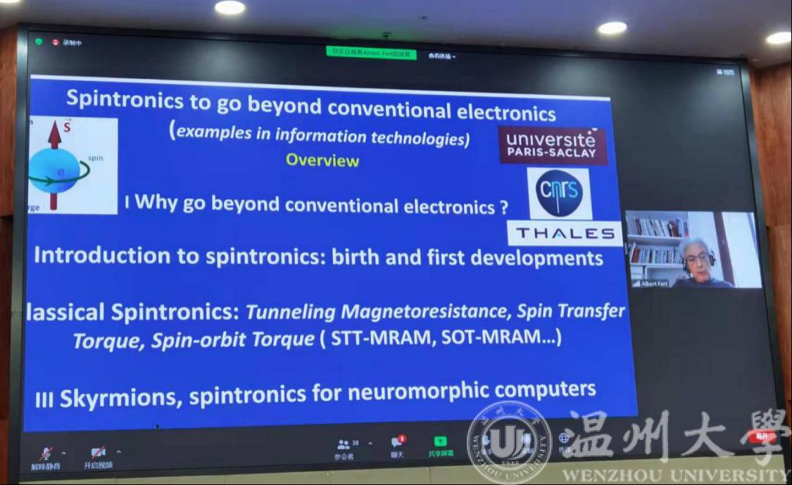 2021年10月25日下午,2021年世界青年科学家峰会科学大使活动费尔教授诺奖报告会在我校岩松堂雁山厅举行。本次报告会,以我校为主会场,北京航空航天大学、浙江大学为分会场,采用现场会议+视频联线仪式,通过线上线下结合形式举行。我校beat365在线唯一官网负责主会场活动。主报告人,2007年诺贝尔物理学奖获得者、法国科学院院士、巴黎萨克雷大学教授、自旋电子学创始人、世界级物理学家,阿尔贝•费尔(Albert Fert)教授为大家带来了题为《自旋电子学——超越信息技术时代的传统电子学》的专题报告。