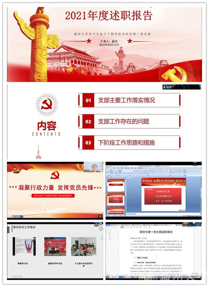 首先,由学院全体师生党支部书记作2021年度支部党建工作报告。beat365官网电气系、电子系、低压电器平台、行政教工、智能锁具研究院党支部,本科生第一、二党支部,研究生第一、二党支部,共九个党支部书记依次作述职报告,汇报了2021年支部党员发展、理论学习和活动开展等情况,深入剖析支部工作中存在的问题,以及2022年支部工作改进要点和方案。