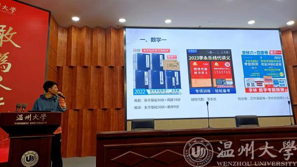 随后,7位毕业班同学依次上台汇报,在高校及专业选择、备考资料推荐、时间规划和管理、线上复试经验等方面分享了切身体会,鼓励学弟学妹们要瞄准考研目标,坚定自己的信念。多位学长学姐都提到了在复习时间的安排上,可以较早开始准备专业课的学习,其中吴鑫涛同学强调学习效率是第一位,要注重有质量的学习,找到让自己效率高的方法;倪世杰同学指出选择和努力一样重要,要做好正确的选择才能少走弯路;谢歆哲同学提出要戒骄戒躁,坚定自己的选择,不盲从各种考研博主和公众号,按着自己的步伐稳步向前。与此同时,学长学姐们也鼓励大家勇于报考985、211等实力更强的学校,要对温大的招牌有信心。学长学姐们都不约而同提到了竞赛的重要性,建议大一大二的同学多参加各类竞赛,不仅为自己积攒经验,也是在复试面试中尤为加分的一项。