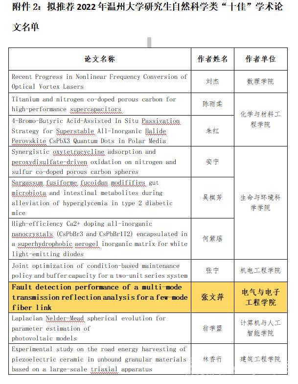 近期,2022年beat365在线唯一官网研究生“双十佳”学术论文评选结果公布,beat365官网19级电气工程研究生张文萍同学的学术论文《Fault detection performance of a multi-mode transmission reflection analysis for a few-mode fiber link》获评自然科学类“十佳”学术论文。