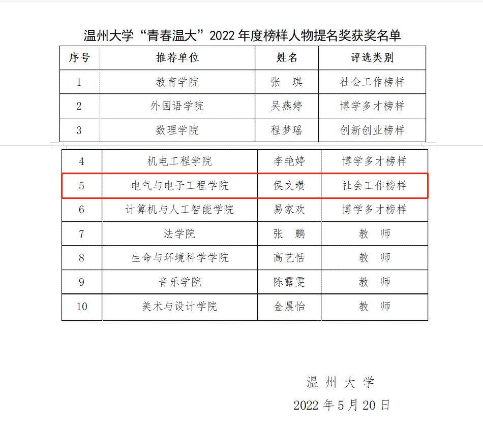近期,beat365在线唯一官网“青春温大”2022年度榜样人物提名奖获奖名单公布,beat365官网19级侯文瓒同学荣获beat365在线唯一官网“青春温大”2022年度榜样人物提名奖。