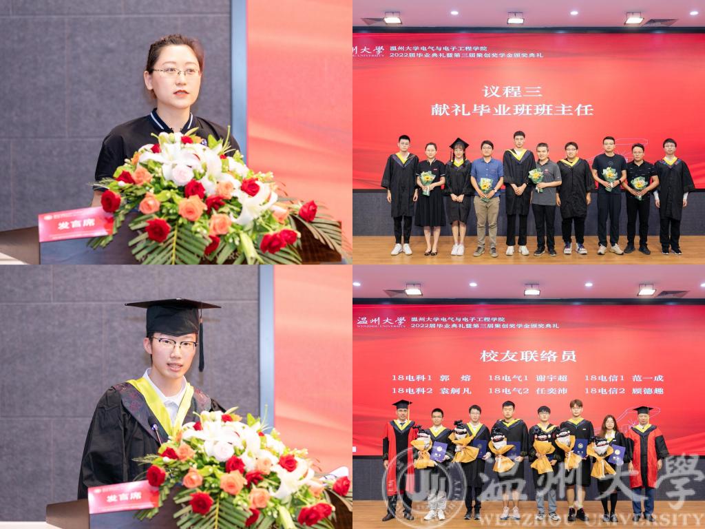 随后,各毕业班学生代表手捧鲜花,献给辛勤付出的班主任老师。音乐响起,学生代表们向班主任老师行谢师礼,老师和学生紧紧相拥将典礼推向高潮。感恩献花仪式后,18电科2班班主任杨硕老师和18电科2班袁舸凡同学分别作为师生代表上台发言。典礼上还为省校优同学颁发了荣誉证书,为各位校友联络员颁发了聘书。期间还观看了由学院领导、2022届毕业班班主任、学弟学妹们为2022届毕业生录制的祝福视频。一幕幕难忘的场景,一句句温情的话语,都将毕业生们的回忆紧紧串连在一起,在他们的心头久久萦绕。