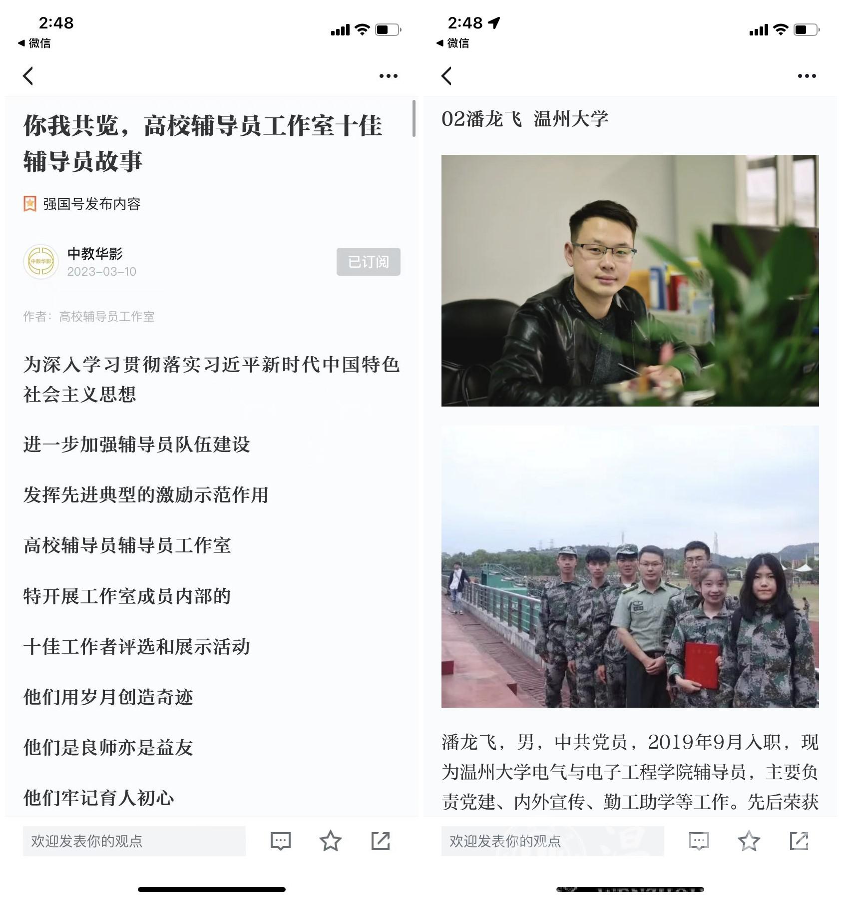 3月10日,学习强国刊发了一篇名为《你我共览,高校辅导员工作室十佳辅导员故事》的文章,该篇文章系全国高校辅导员工作室,为深入学习贯彻落实习近平新时代中国特色社会主义思想,进一步加强辅导员队伍建设,发挥先进典型的激励示范作用,进行的十佳工作者评选和展示活动,beat365在线唯一官网辅导员潘龙飞也在其中。