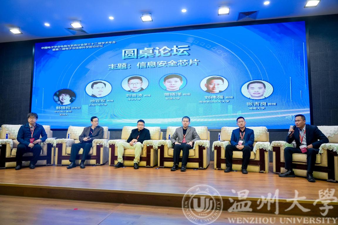 大会圆桌论坛环节,在中国科学院计算所韩银和研究员的主持下,上海科技大学哈亚军教授、清华大学刘雷波教授、南京航空航天大学刘伟强教授、复旦大学曾晓洋教授、华南大学张吉良教授围绕信息安全芯片主题做交流和分享。