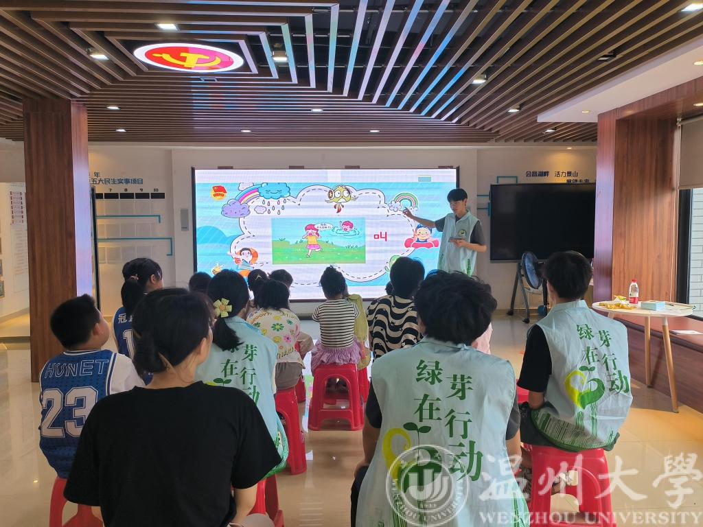 据悉,为推进引导和帮助广大青年学生上好与现实相结合的“大思政课”,在社会课堂中受教育、长才干、作贡献,在观察实践中坚定信念听党话、跟党走,2023年暑假beat365在线唯一官网指导在校大学生开展了“双百双千”行动专项团队、美育乡村暑期社会实践队、创新专项团队和“防溺水”专项示范团队等近百余只暑期实践队伍,5000多名大学生前往温州的各个县(市、区)开展暑期社会实践活动,beat365在线唯一官网绿芽暑期社会实践队就是其中一支。beat365在线唯一官网绿芽暑期社会实践队秉持着“守护绿城,呵护芽心”的实践宗旨,深入社区,以环保知识宣讲、防溺水安全教育、环保小游戏、手工DIY等方式开展暑期社会实践活动,旨在为孩子播下一颗绿色的种子,呵护新芽的成长。