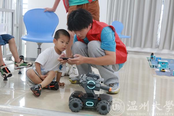 云智立实践团队成员通过现场展示和互动体验,向参与的孩子们展示了智能机器人的高效操作,智能控制系统的运作原理等。孩子们可以亲身体验智能机器人的协作工作,观看智能生产线的自动化流程,深入了解智能制造的全过程。在老师的讲解和示范下,他们新奇地 体验着各种各样的科技项目,包括智能小车控制、 VR、智能制造学习工场、工业机器人视觉实践、工业机器人与数控机床实践等内容,用视觉和触觉零距离感受Al科技带来的魅力。