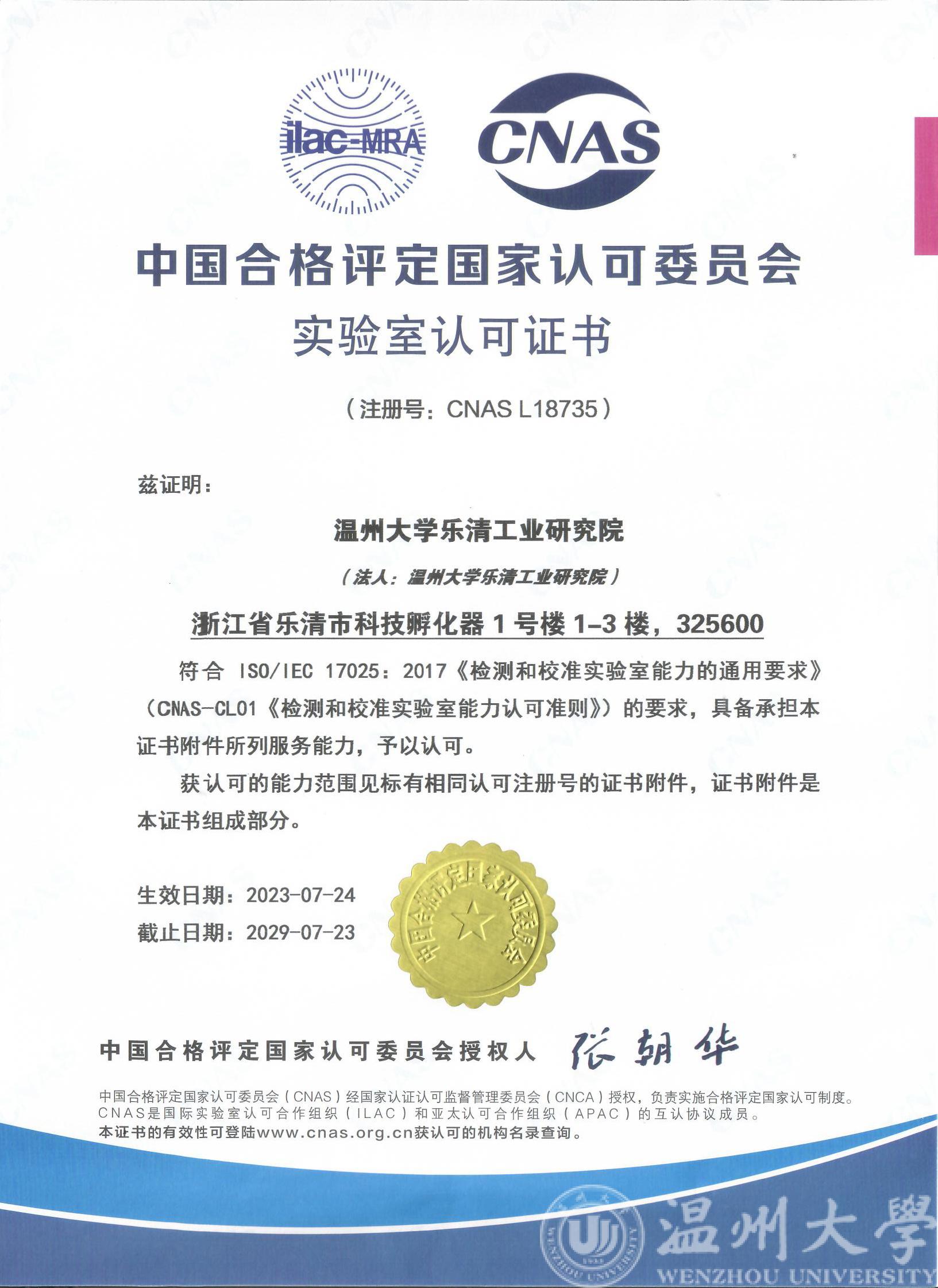 2023年7月,beat365在线唯一官网乐清工业研究院喜获CNAS、CMA证书,助力电气产业产品研发测试创新能力提升!