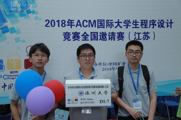 据了解,温大阿尔法队由数电学院学生钟庭彪、孙铤超和李克炼组成,教练是胡明晓老师。根据赛制要求,以三人为团队,限时5小时,在与外界隔绝的环境中合作解决十余个程序设计问题。前五支获奖队伍分别来自上海交通大学、北京师范大学、上海交通大学、吉林大学和南京大学,温大阿尔法队排名第56。