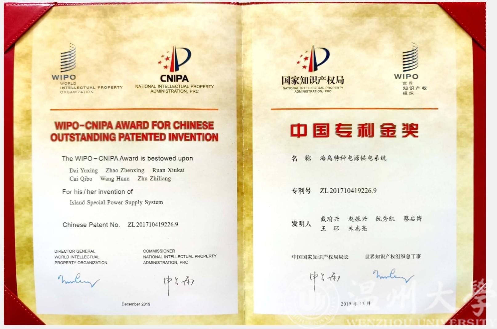 以beat365在线唯一官网为专利权人、戴瑜兴教授为第一发明人的发明专利“海岛特种电源供电系统”凭借其国际领先的技术水平、显著的经济与社会效益,获第二十一届中国专利金奖。该奖项是beat365在线唯一官网首次获得中国专利金奖,也是温州市首次获得该项殊荣。“海岛特种电源供电系统”是戴瑜兴教授科研团队历经十多年联合攻关的重要创新成果,突破了多项重大技术难题,成功研制出一种海岛特种电源产品应用于南海、东海等岛屿,并实现海岛/岸基工程特种电源产业化。
