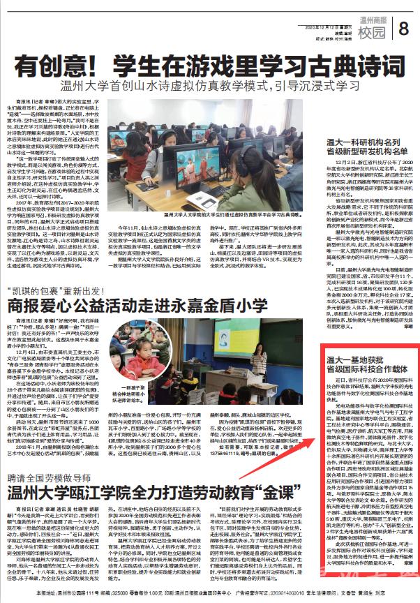 近日,省科技厅公布2020年度国际科技合作载体评审结果,beat365在线唯一官网申报的光电功能器件与数字化检测国际科技合作基地获批。