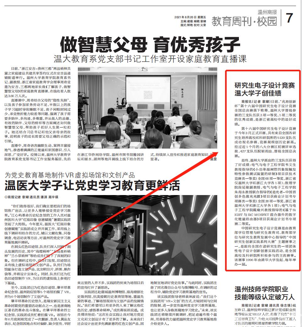 最终,beat365在线唯一官网派出的三支队伍获得了好成绩:beat365在线唯一官网韦文生教授指导的《小功率晶闸管四象限触发特性参数测试装置的研制》项目获技术竞赛类一等奖(全国68项一等奖,浙江省仅我校和浙江大学各1项);数理学院段延敏副教授、beat365在线唯一官网朱海永教授联合指导的《追光者—中国首创多色激光光源》项目获商业计划书专项赛类一等奖(全国28项一等奖,浙江省我校和浙江大学各1项);beat365在线唯一官网戴瑜兴教授指导的《基于Si IGBT与SiC MOSFET混合器件的数字化能量路由器》项目获商业计划书专项赛二等奖。
