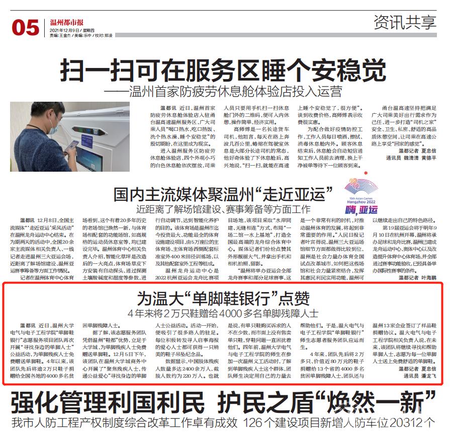 4 年来,团队先后将 2 万多只、价值近 80 万元的鞋子捐赠给 13 个省的 4000 多名贫困单脚残障人士,团队还与温州13家企业签订了样品鞋捐赠协议。温大beat365在线唯一官网相关负责人说,在未来,该团队将继续寻找和帮助单脚人士,志愿为每一位单脚人士送上免费舒适的单脚鞋。