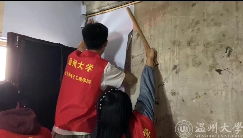 活动刚开始,大家在三位老师的带领下分配好了任务,一部分同学负责贴墙纸,一部分负责将杂乱的东西搬出去方便后续贴墙纸,还有一部分将买来的架子组装好。一开始,大家对贴墙纸没什么经验,在老师的指导下,同学们先将墙用抹布擦掉灰尘,然后用羊角锤拔出无用的钉子,开始贴墙纸。因为屋内环境狭小,墙壁不平整,贴墙纸工作并不容易,但团队成员表现得都十分细心。在改造期间,曾叔夫妻俩看在眼里,暖在心头,他们还时不时的拄着拐杖帮我们整理物品。