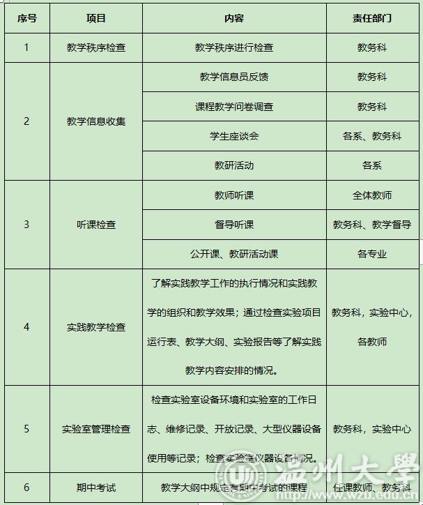 教务科组织对教学计划与教学进度执行情况及教学秩序进行检查。检查任课教师上课迟到、早退、旷课、擅自调停课及相关请假手续执行情况(包括所有课程)。检查申请停课的教师是否已经按规定进行补课等。检查学生到课及上课情况。