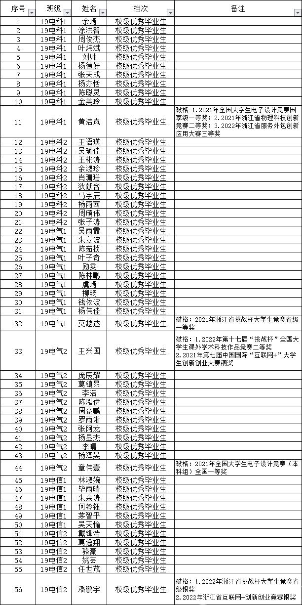 根据《beat365在线唯一官网优秀毕业生评选办法》(温大行政发[2020]104号),按照学校初次分配名额,根据前期进行2023届校级优秀毕业生的预评选,推荐 19电科1 余琦 等56名同学获得校级优秀毕业生荣誉称号,现将名单进行公示。