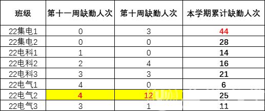 2022级第十一周早晚自习缺勤情况如下: