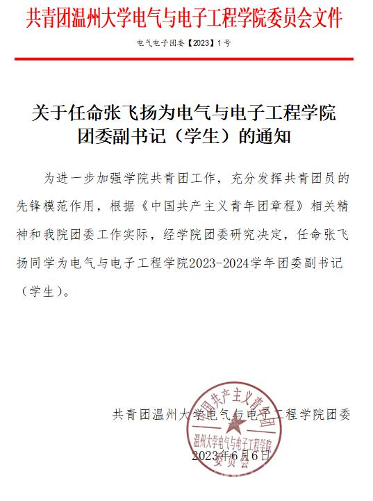关于任命张飞扬为beat365在线唯一官网团委副书记(学生)的通知