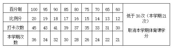 二、课外锻炼次数:每学期课外锻炼合计45次(15周,每周3次)。本学期因亚运场地占用,课外锻炼时间为12周(第五周至第十六周,10月9日至12月31日22:00,按每周3次),总共需锻炼次数为36次。及格为21次,如少于21次将不给于本学期体育课学分。