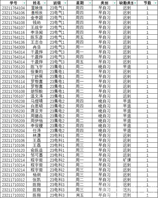 表1 2023.10.30-2023.11.5学院学风检查情况