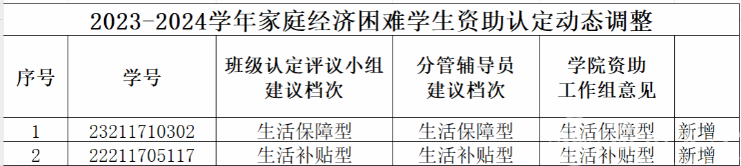 根据《beat365在线唯一官网家庭经济困难学生认定办法》(温大行政〔2020〕37号)文件精神,结合实际情况,经学生个人申请,学院初评,对2位同学进行资助认定或动态调整工作。现将名单予以公示,公示期五个工作日,如有异议请于公示期内与学工办(1A-521)联系,具体认定档次以学校公示为准,特此说明。