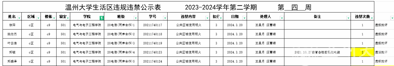 自2023-2024学年第二学期入学开始,学校针对宿舍安全每周进行大排查。根据学校第四周、第五周寝室安全卫生检查结果,第四周排查到6位同学,第五周排查到1位同学存在寝室违规现象,受到学校通报;现根据学校相关规定,对上述同学进行院内通报批评,请其他同学引以为戒(名单见下)。