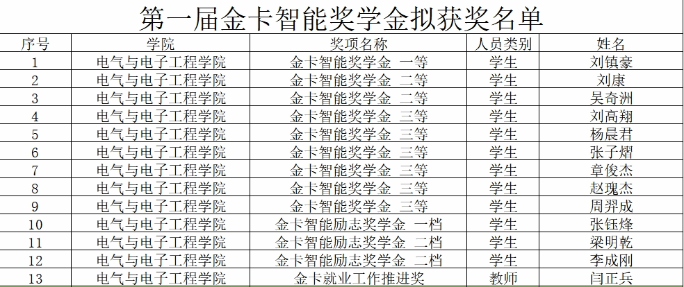 根据《“金卡智能奖学金”实施方案》文件精神,经个人申请,学院初评,金卡集团复评,拟推荐以下师生获评第一届“金卡智能奖学金”:
