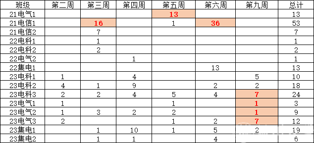 开学至今各班缺勤情况统计如下: