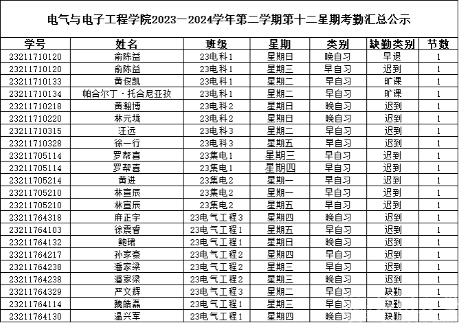 第十二周早晚自习缺勤及课堂出勤情况如下: