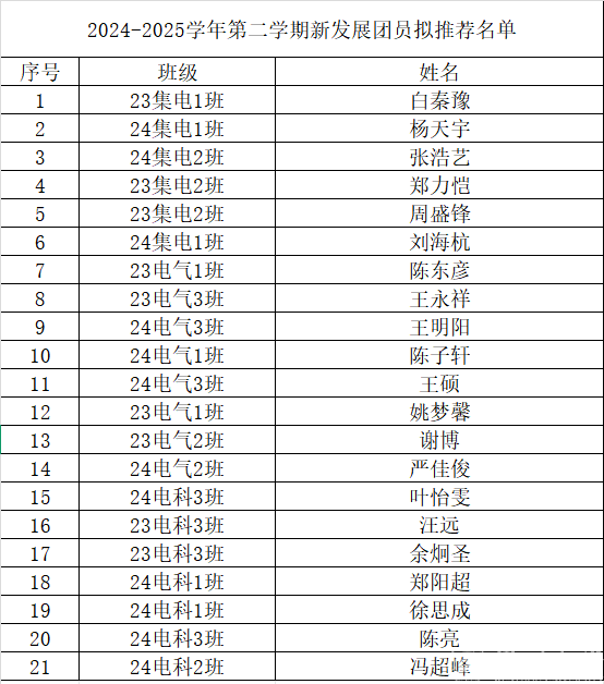 根据《中国共产主义青年团章程》《关于做好2024-2025学年第二学期团员发展与管理工作的通知》等相关要求,经本人自愿申请、团支部推荐,结合在校综合表现,经学院团委评议审核,拟将余炯圣等21名青年学生发展为共青团员。