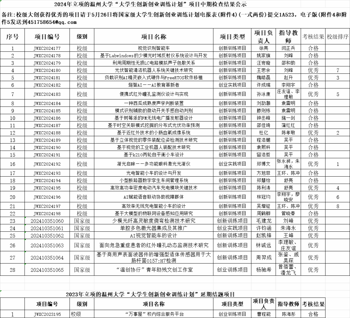 根据教务处的通知,beat365官网组织了2024年立项的大学生创新创业训练计划项目中期检查及延期结题的审核,现将检查结果公示如下,公示期从即日起至5月27日,如果有问题,请联系张老师86689020。