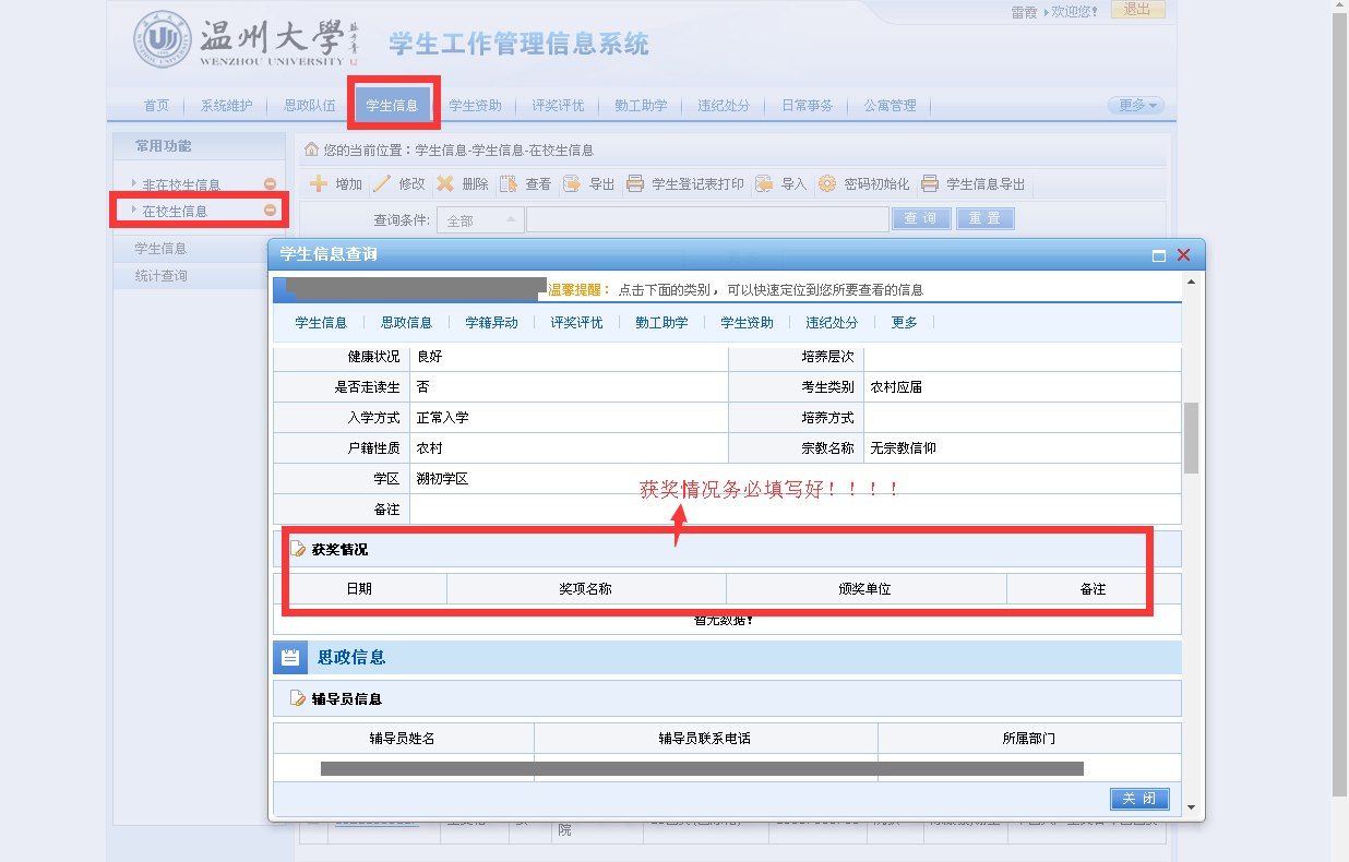 3、老生:除了个人信息、工行卡号改变外,获奖情况务必填写,国家奖学金、省政府奖学金、励志奖学金申请时需要这个项目)。